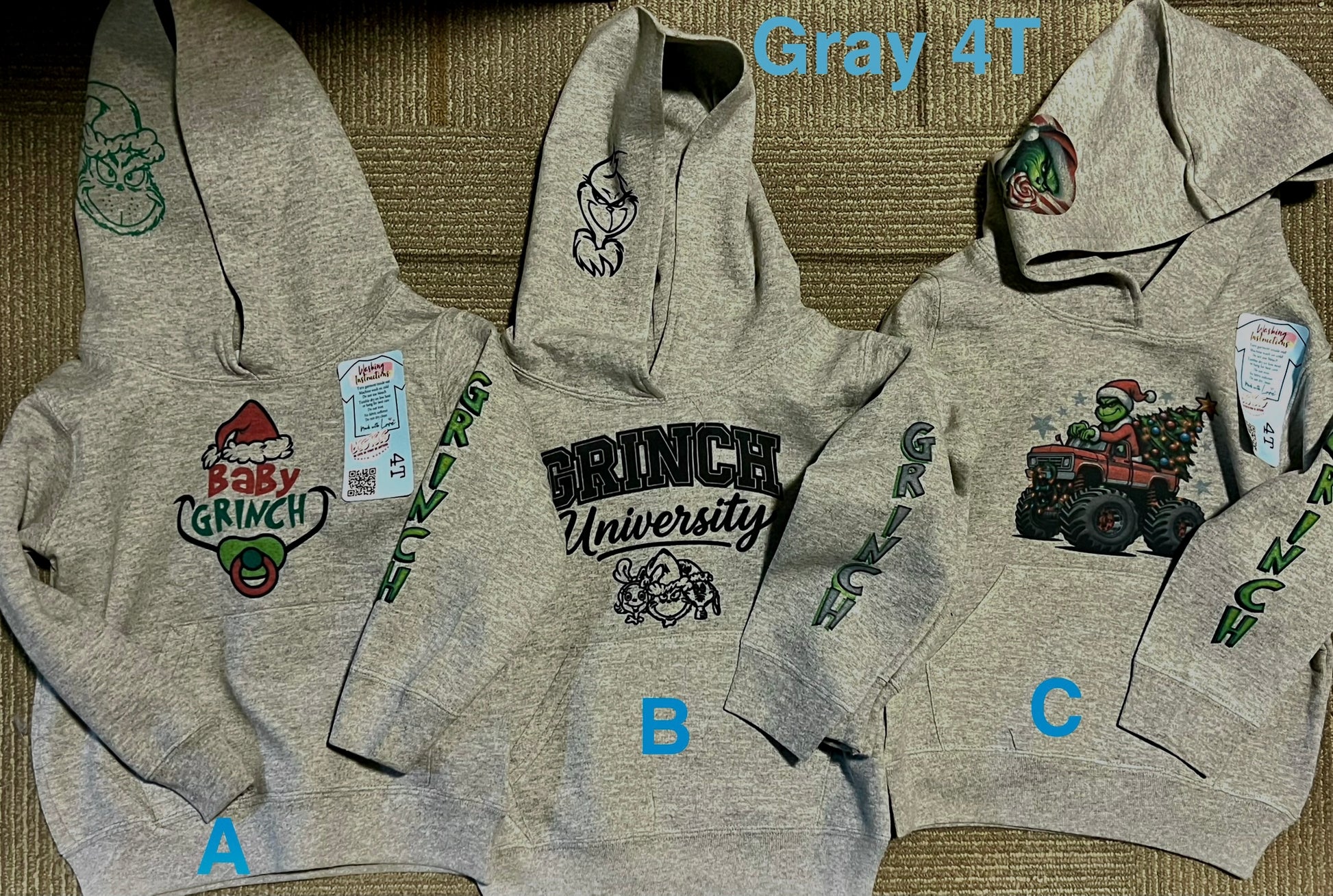 For Toddlers choose your size and gray or pink, then pick the letter from the picture that has the design you want. For Youth Hoodies, Choose a size and then letter because they are all Lime. You will want to Hurry, because there is only one of each Design in a size!